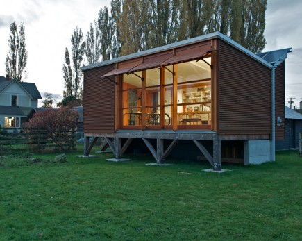Though the design demonstrates a direct response to the flood plain, the simplicity of the footprint and the passive solar approach could easily be adapted to a city lot or vacation parcel with good solar orientation. Additional uses include a detached dwelling unit, vacation cabin or small house, and the plan could be expanded lengthwise to include a bedroom.